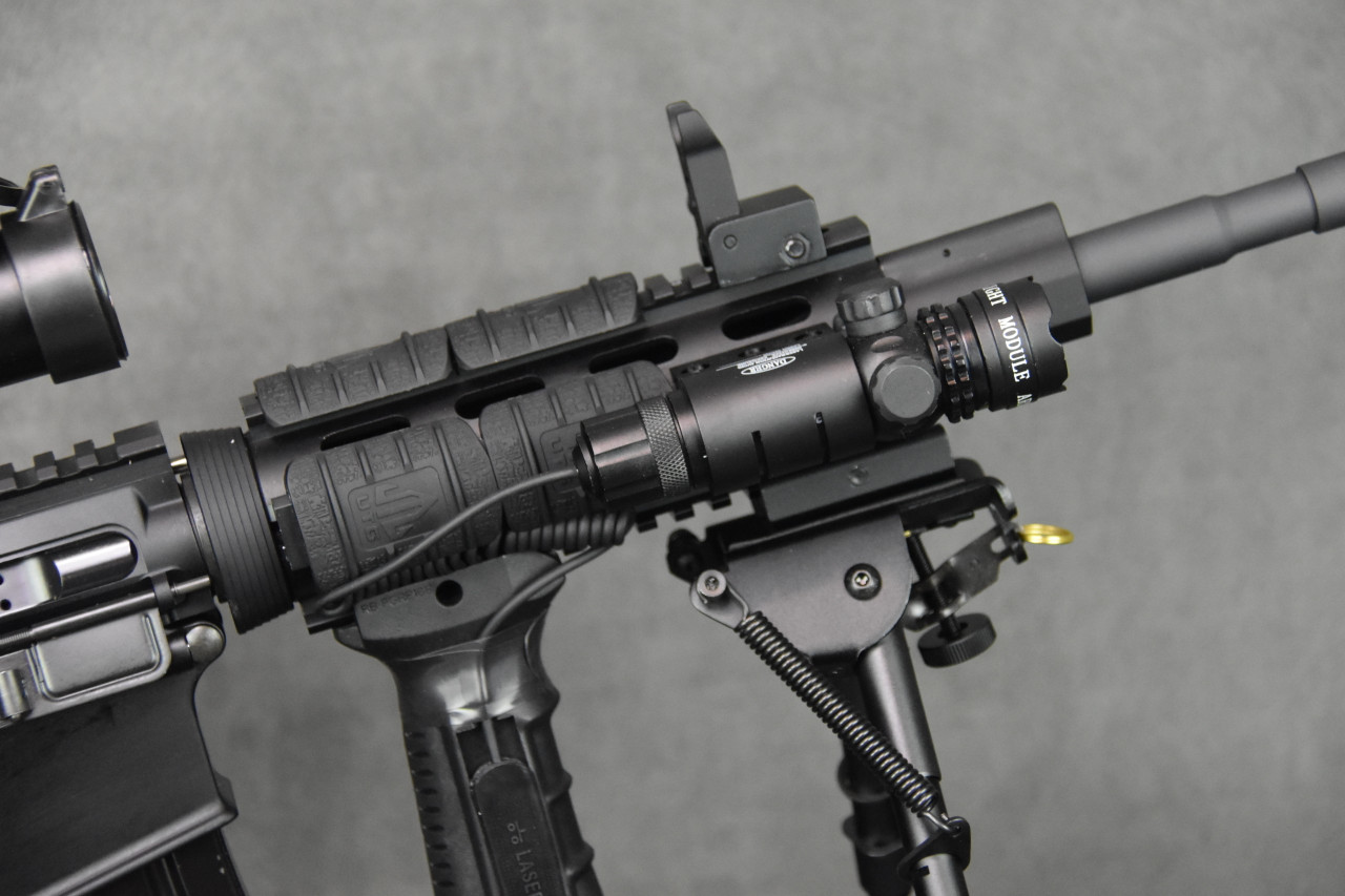 - Sturdy foregrip and foregrip-mounted pressure switch for laser control