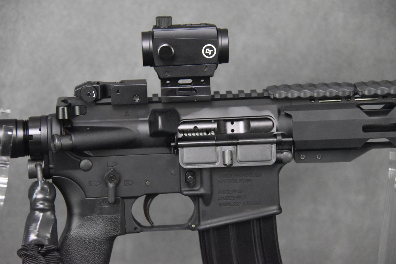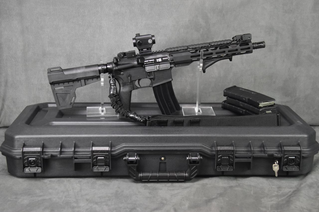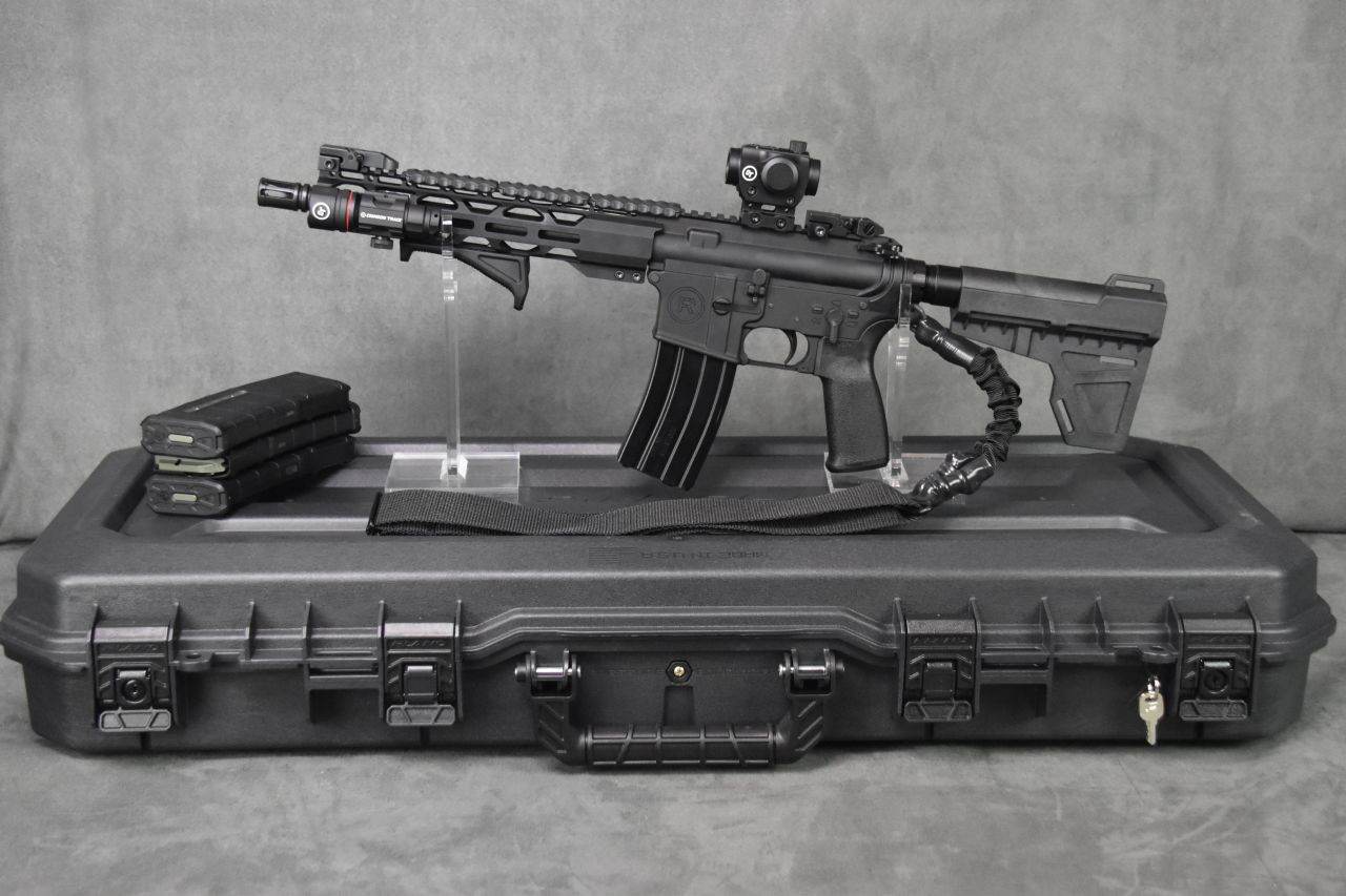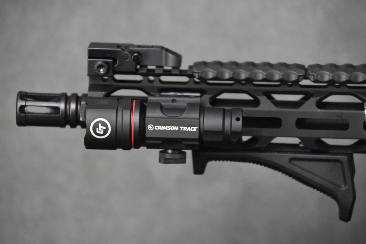 One of our more versatile builds, it packs the power of an AR-15 into a compact package!  Crimson Trace accessories adds trim and flash to this package, mounted in the right locations to provide the greatest degree of ergonomics possible for most shooters.